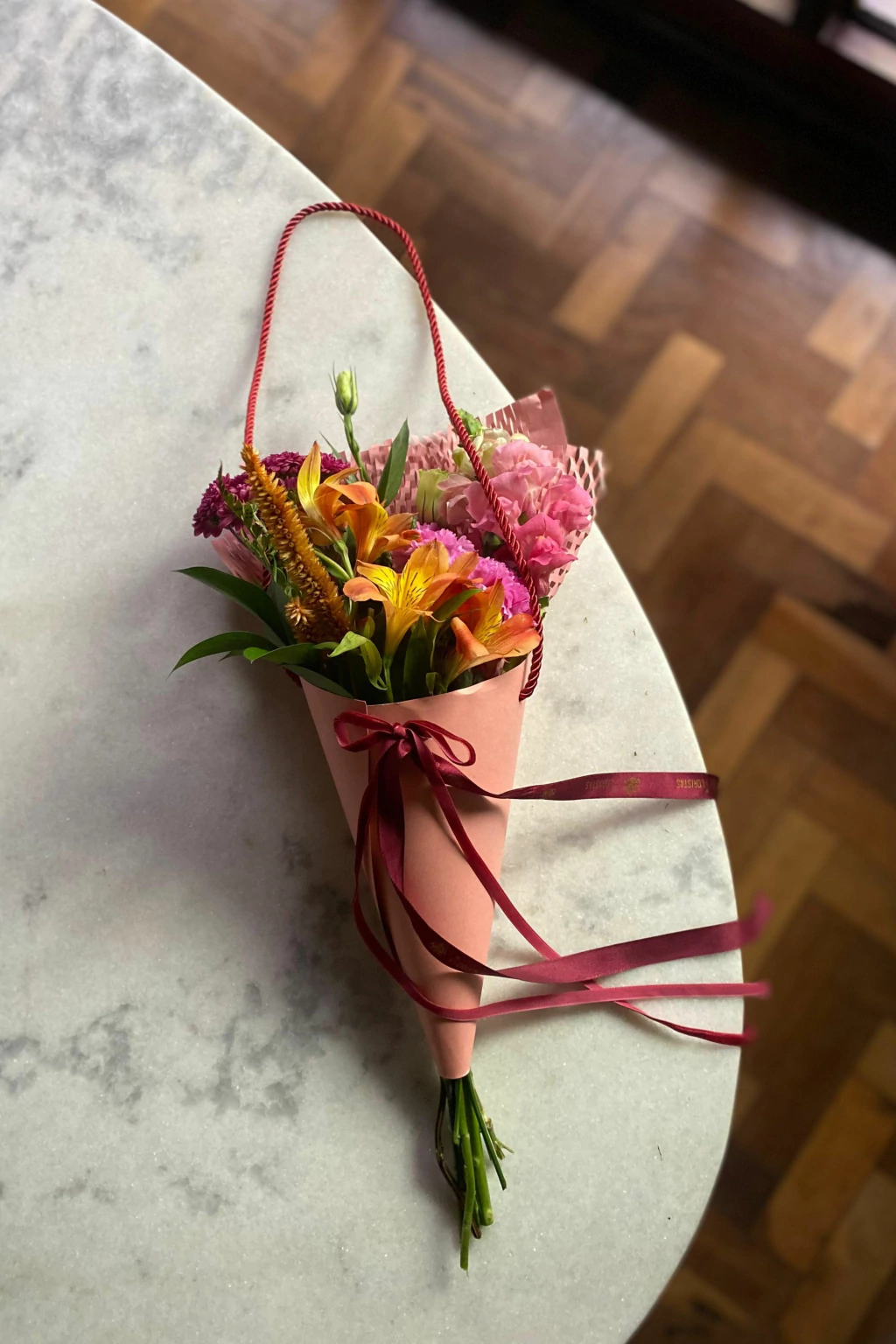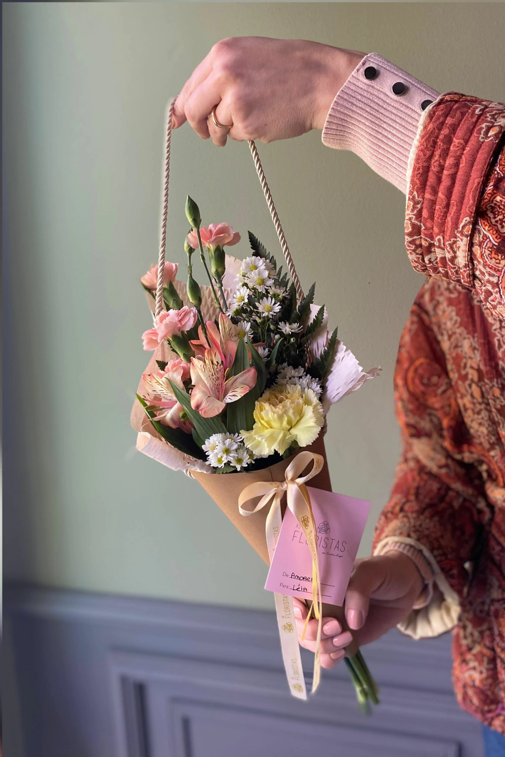 Arranjo de flores variadas no cone de papel com alça em cordão são francisco